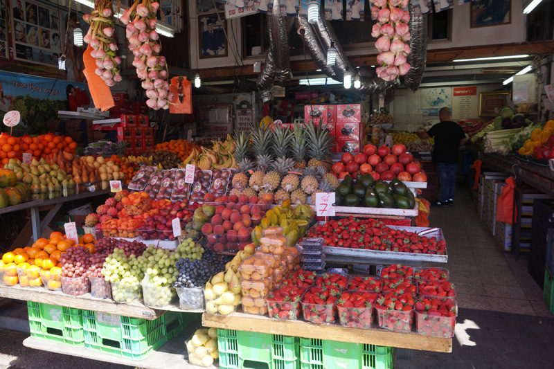 Aujourd’hui, direction le Carmel Market tout proche de notre auberge. Ici, c’est un peu comme un souk, avec une grande allée principale où se côtoient fruits et légumes, épices, pâtisseries, bijoux, vêtements et babioles typiques de tous les marchés.Les étals regorgent de fruits d’une couleur éclatante, les marchands nous interpellent en français, nous ne pouvons que craquer pour un jus de fruits frais, concocté sous nos yeux.